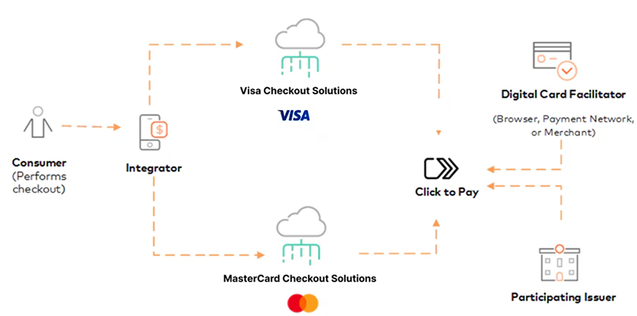 Архітектура Click to Pay базується на взаємодії пʼяти ролей: Integrator, Integration Solutions, Click to Pay, Participating Issuer та Digital Card Facilitator.