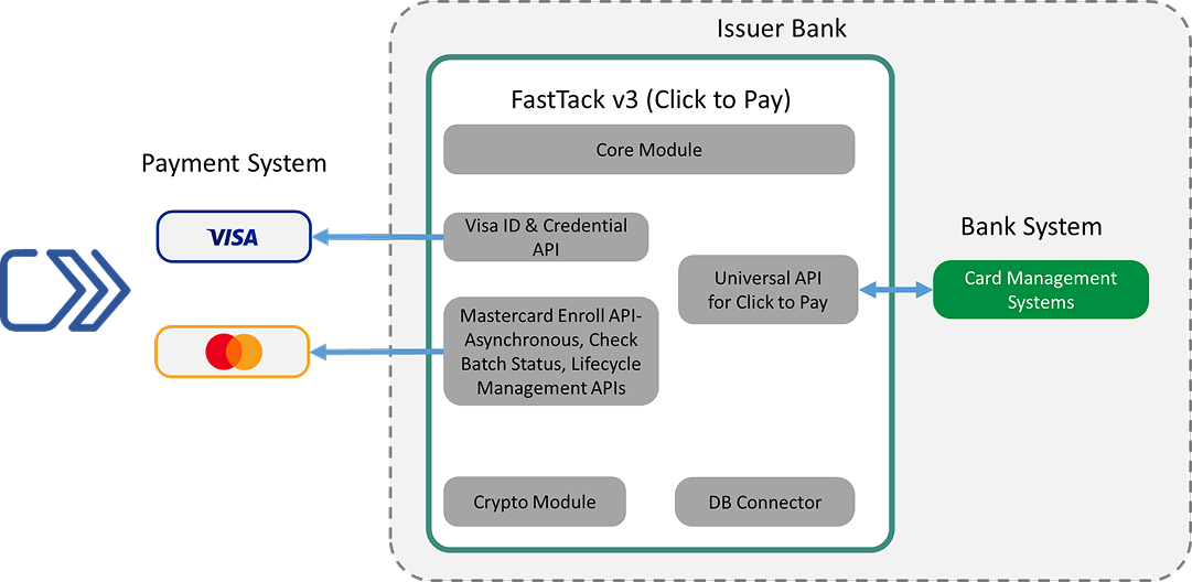 Модуль C2P FastTack розгортається на стороні банку-емітента та виконує роль єдиного інтеграційного компоненту між платіжними системами та внутрішніми банківськими системами.